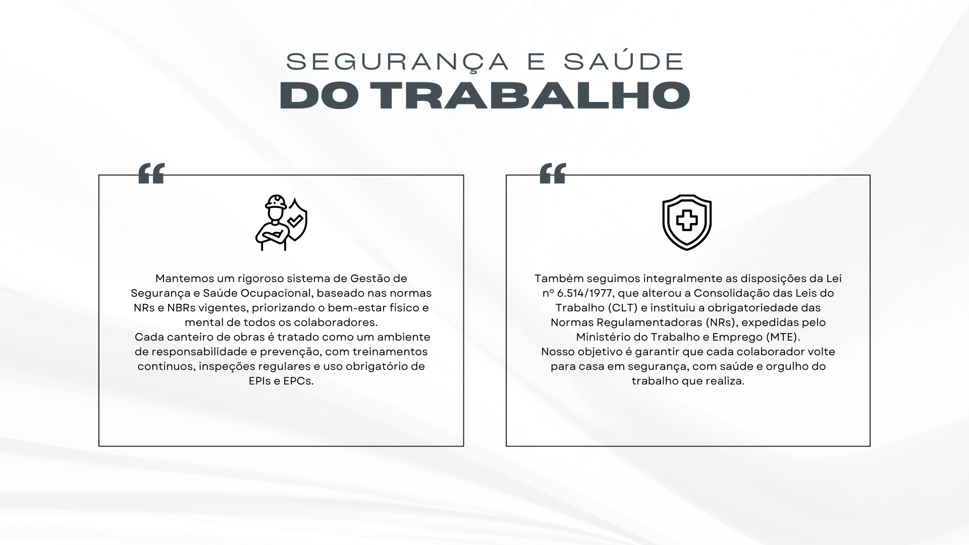 Construímos com ética, qualidade e respeito ao meio ambiente.Valorizamos as pessoas, a inovação e a responsabilidade em cada projeto.Mais do que obras, entregamos confiança, sustentabilidade e propósito em cada projeto.
