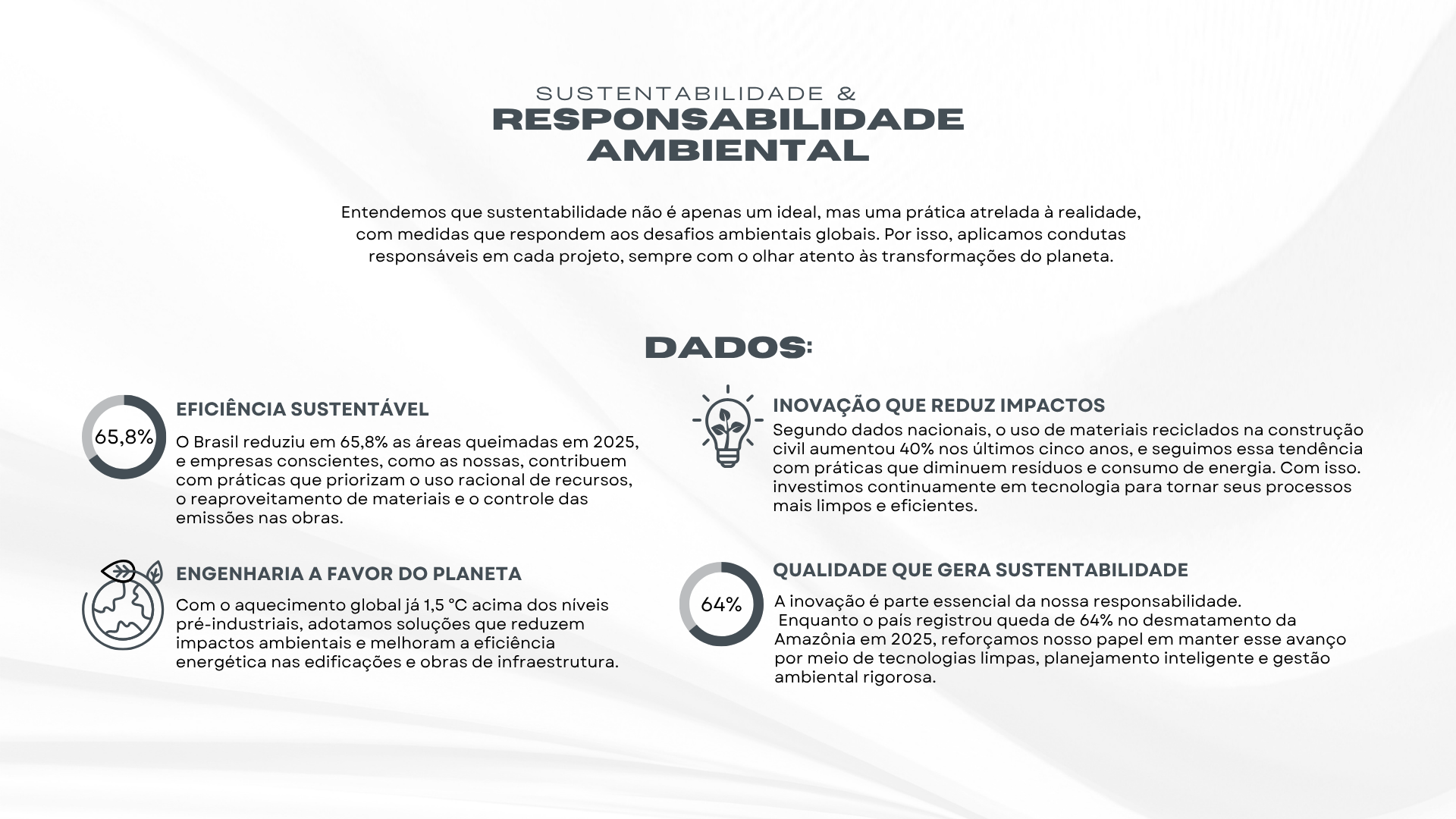 Acreditamos que o futuro da construção civil está na integração entre conhecimento técnico e responsabilidade ambiental, que investe continuamente em tecnologia aplicada à melhoria da vida das pessoas.